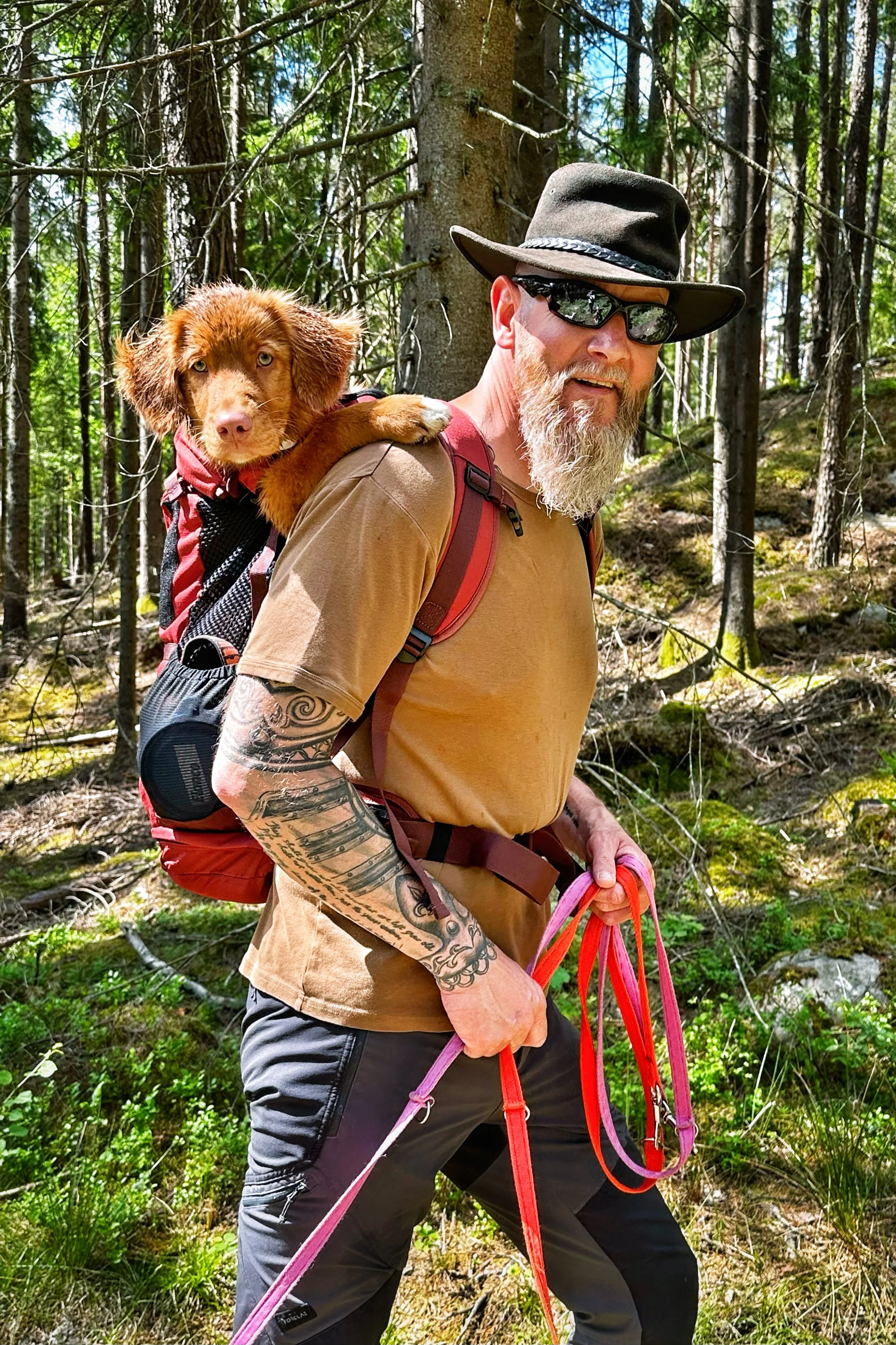 As Luka is also still too young to join us on longer walks, we bought a K9 Sport Sack backpack to be able to take him with us. He accepts it very well and enjoys the walks. Luka learned to swim early on together with daddy Rusty and is a pro already!